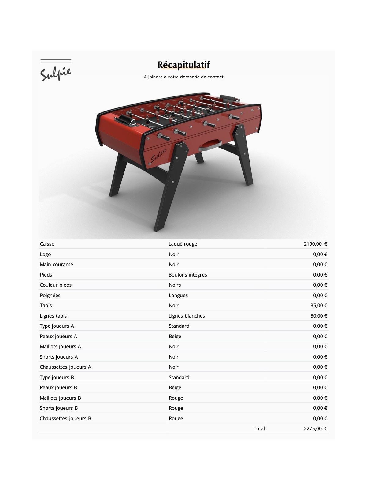 Le modèle Evolution de la marque Sulpie est un baby-foot « haut de gamme » fabriqué en France, conçu pour allier esthétique, robustesse et jouabilité. il est le modèle standard et le modèle plus personnalisable de la marque. Grâce à ses finitions soignées et ses caractéristiques techniques, il peut convenir à un usage familial sérieux ou à un usage plus intensif en loisir/compétition légère.
