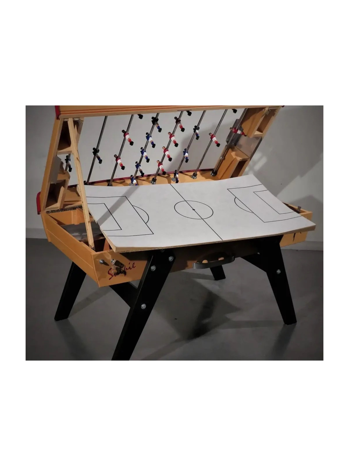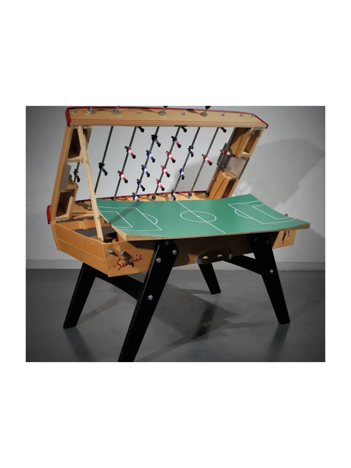 Chaque baby-foot Sulpie est entièrement fabriquée à la main par des artisans expérimentés, selon des procédés mêlant tradition et innovation. L’entreprise privilégie des matériaux nobles, tels que le hêtre massif pour la structure et l’acier chromé pour les barres, garantissant solidité, qualité et durabilité.