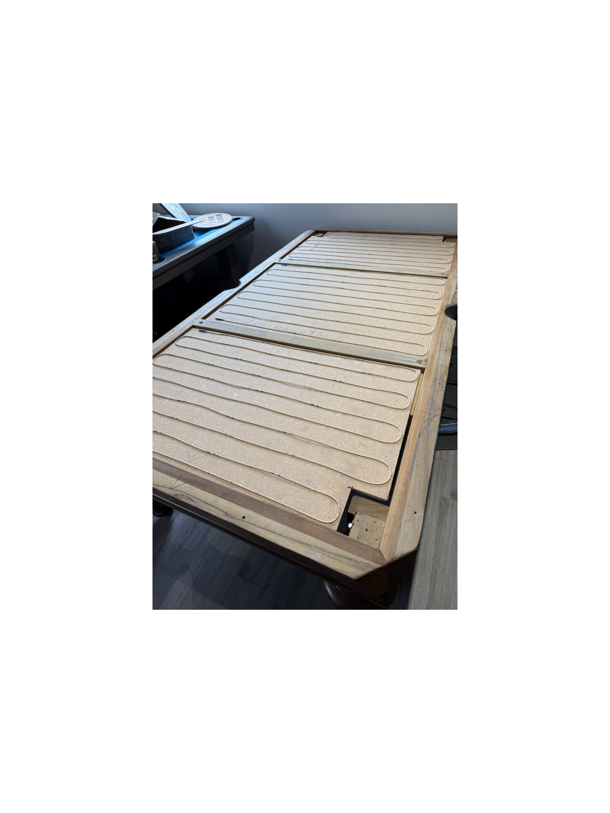 La structure est réalisée en noyer massif avec une finition patine antiquaire et une teinte noyer moyen, apportant un rendu élégant et authentique. La surface de jeu repose sur une ardoise en trois parties d’une épaisseur de 30 mm, garantissant une planéité parfaite et une précision professionnelle.
