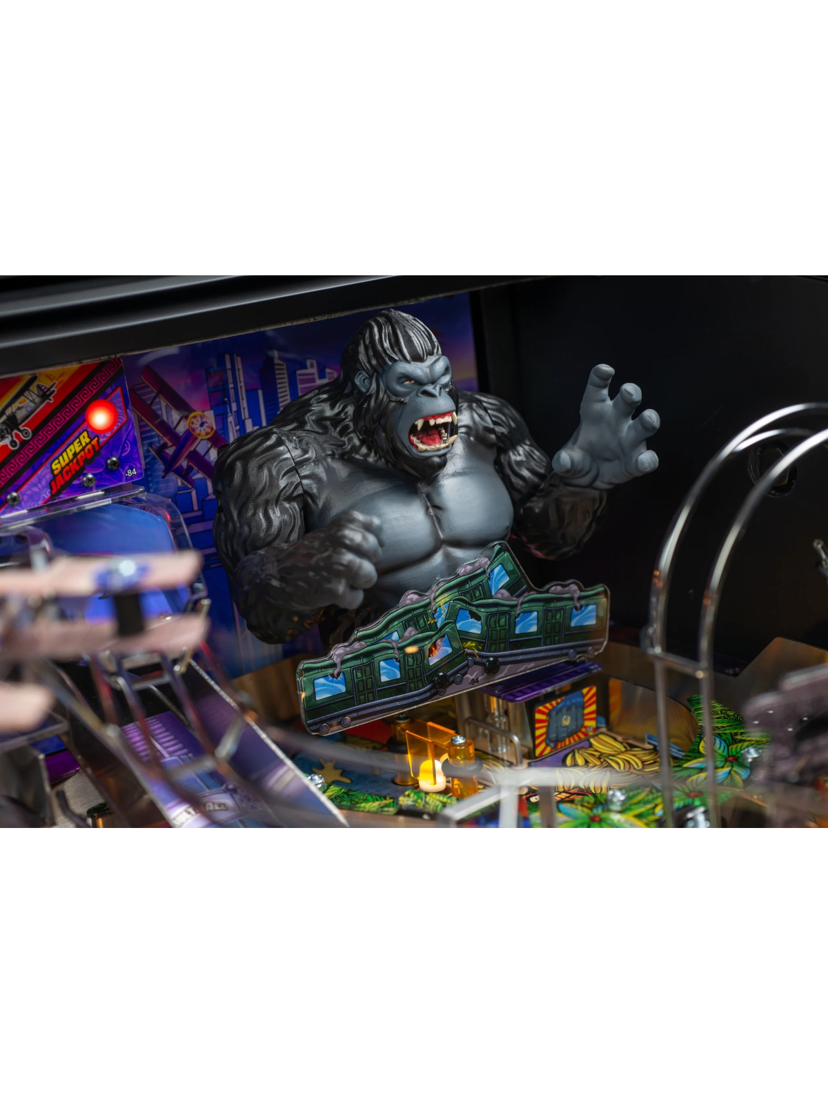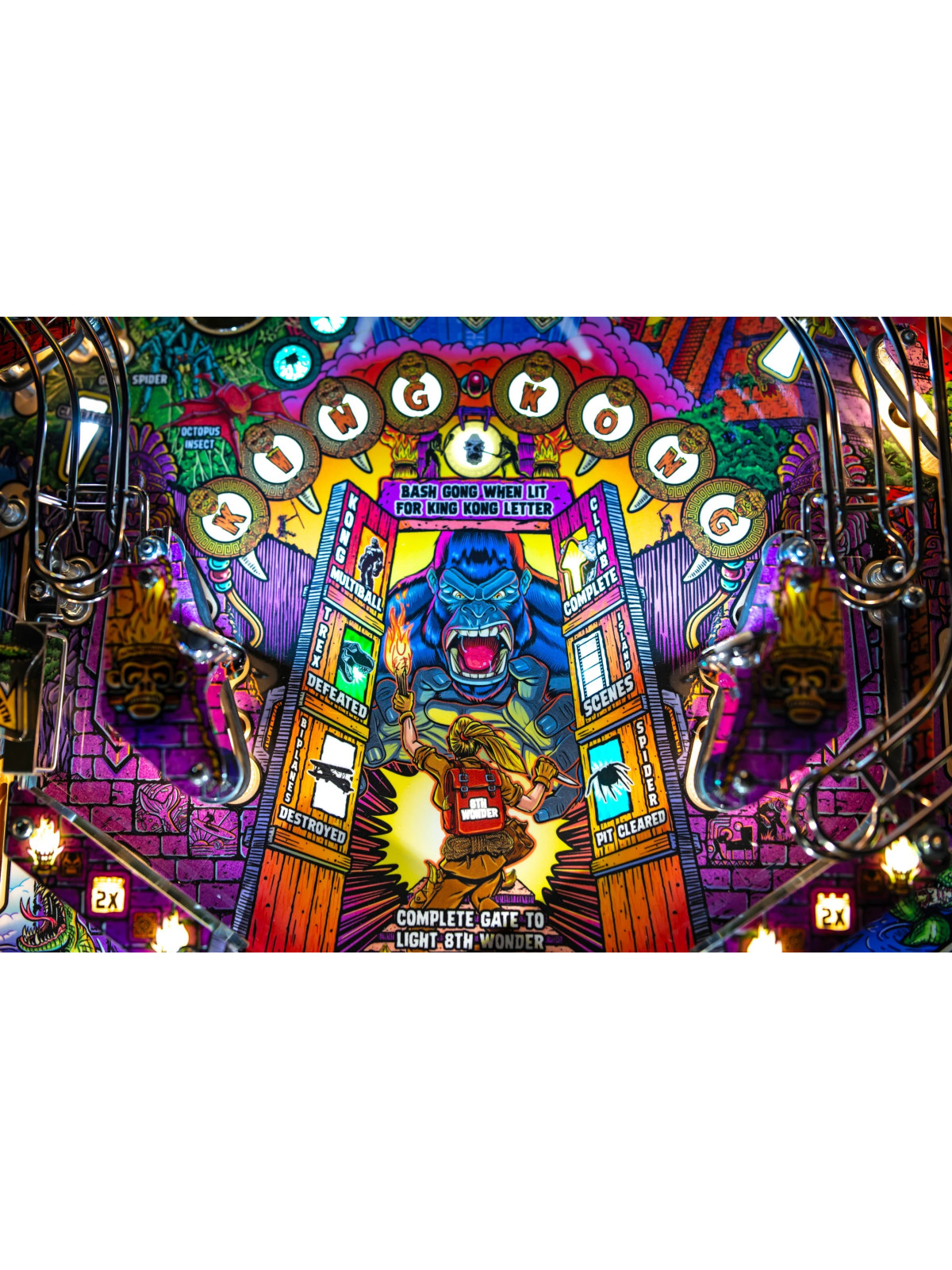 Le plateau de jeu intègre plusieurs éléments interactifs majeurs, dont des rampes complexes, des cibles tombantes, un kicker vertical, des zones de tir dédiées et quatre batteurs permettant un contrôle précis de la bille. Une sculpture animée de King Kong, dotée de mouvements synchronisés, renforce l’immersion en déclenchant des séquences de jeu avancées, notamment les modes multibilles.