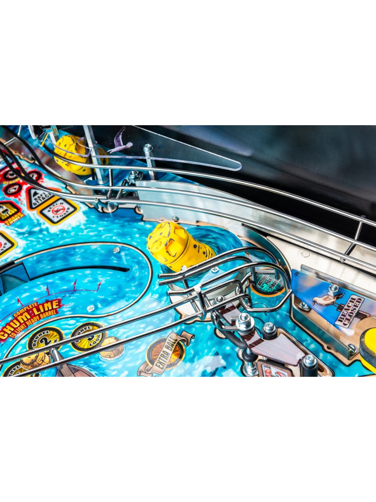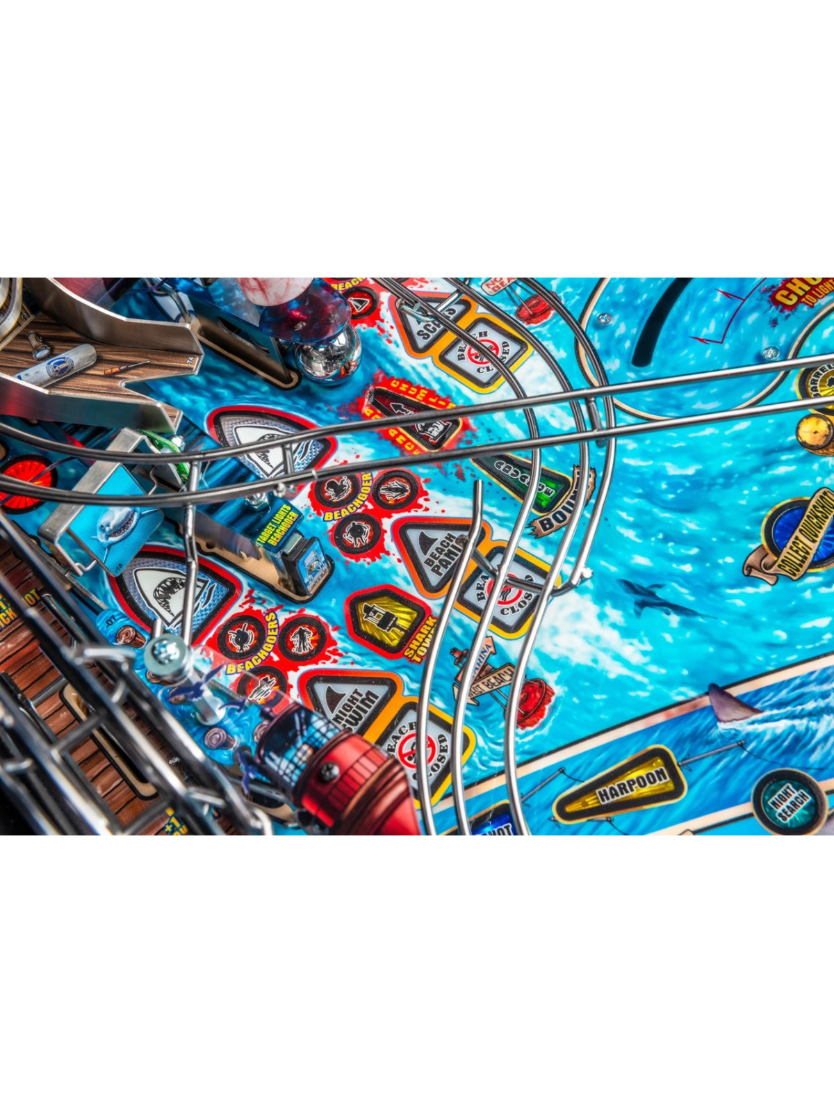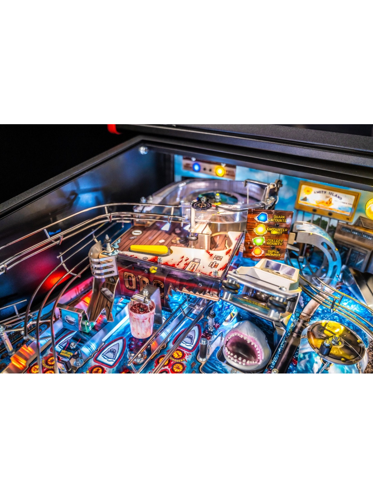 Le plateau de jeu se distingue par une architecture particulièrement dynamique : rampes métalliques rapides, cibles tombantes, spinners, zones thématiques inspirées de l’île d’Amity et mécanisme motorisé représentant la nageoire du requin. Des modes narratifs et multibilles s’appuient sur les scènes emblématiques du film, offrant une progression fluide, variée et dotée d’une forte rejouabilité. Les versions Premium et Limited Edition enrichissent l’immersion grâce à des éléments mécaniques supplémentaires, des décors améliorés et des séquences visuelles renforcées.