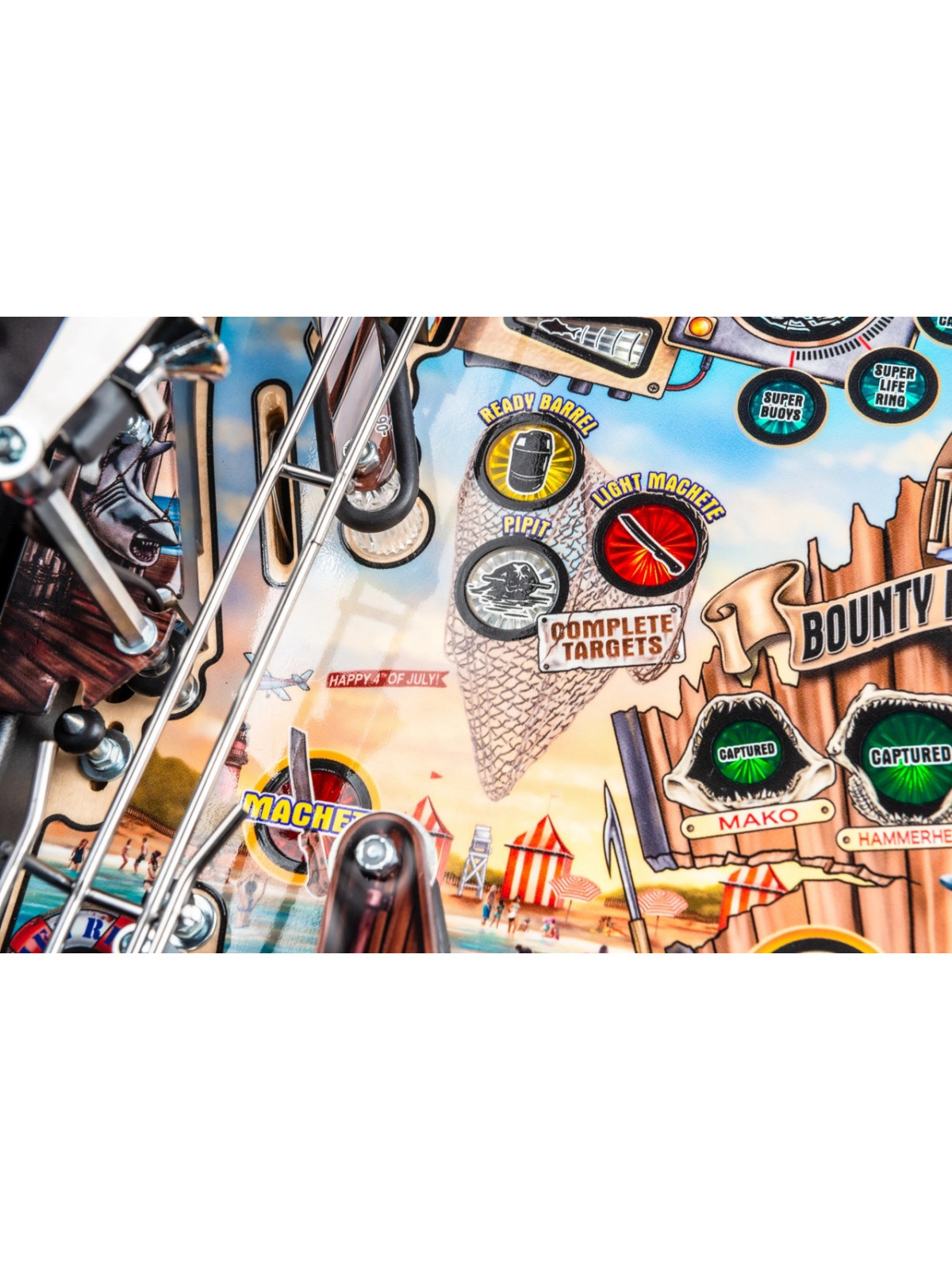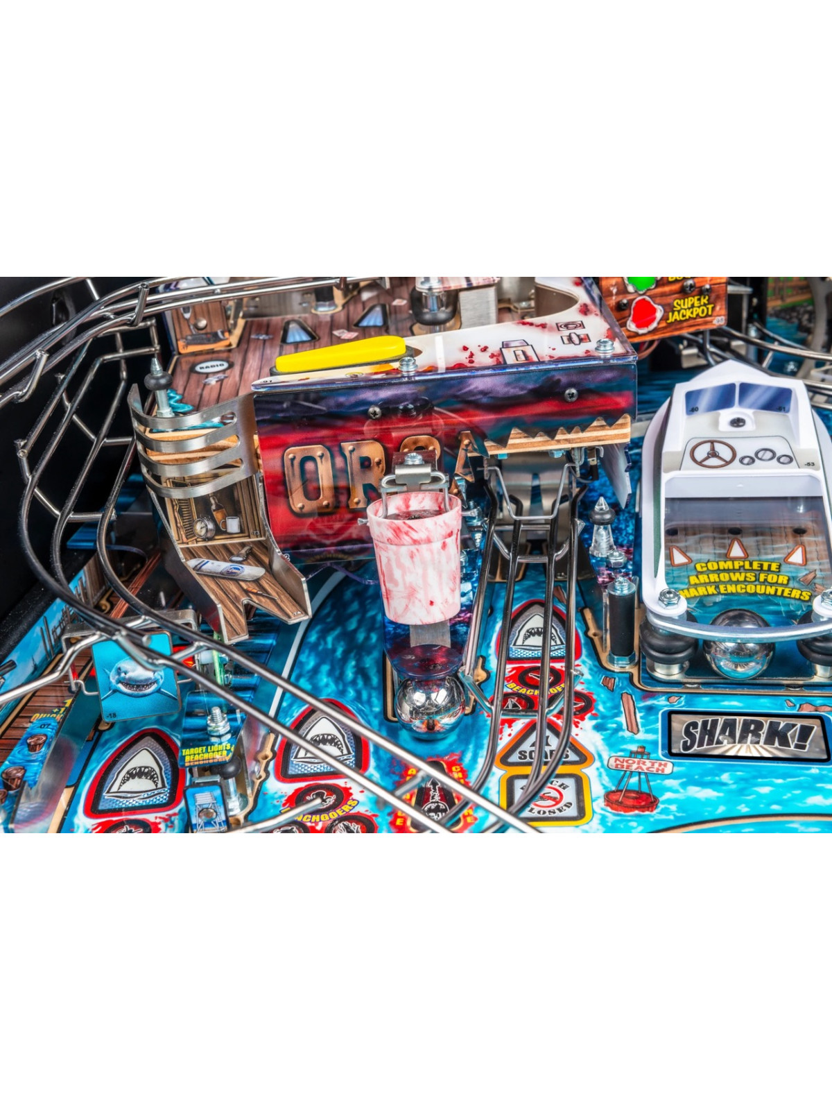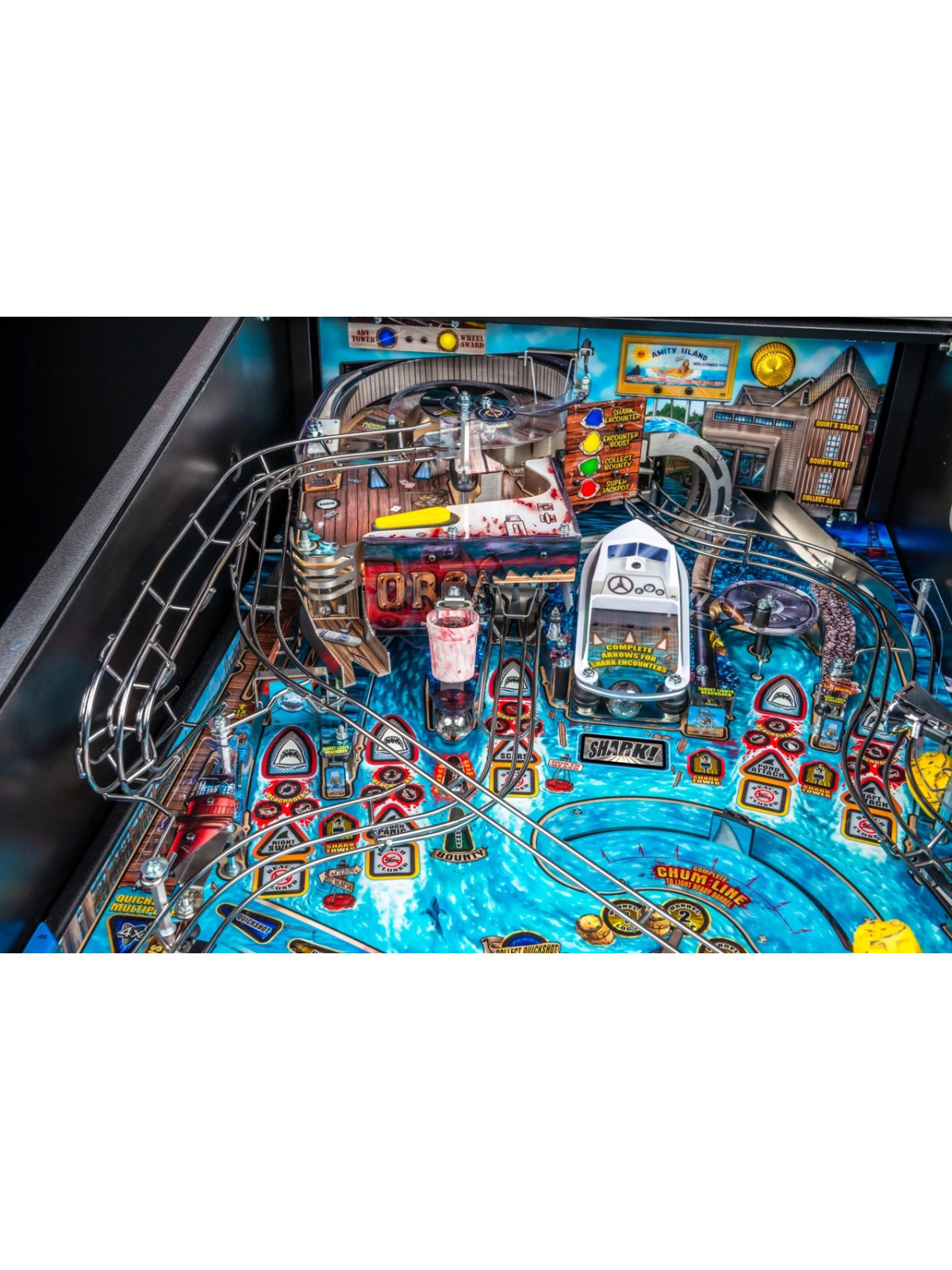 Le plateau de jeu se distingue par une architecture particulièrement dynamique : rampes métalliques rapides, cibles tombantes, spinners, zones thématiques inspirées de l’île d’Amity et mécanisme motorisé représentant la nageoire du requin. Des modes narratifs et multibilles s’appuient sur les scènes emblématiques du film, offrant une progression fluide, variée et dotée d’une forte rejouabilité. Les versions Premium et Limited Edition enrichissent l’immersion grâce à des éléments mécaniques supplémentaires, des décors améliorés et des séquences visuelles renforcées.