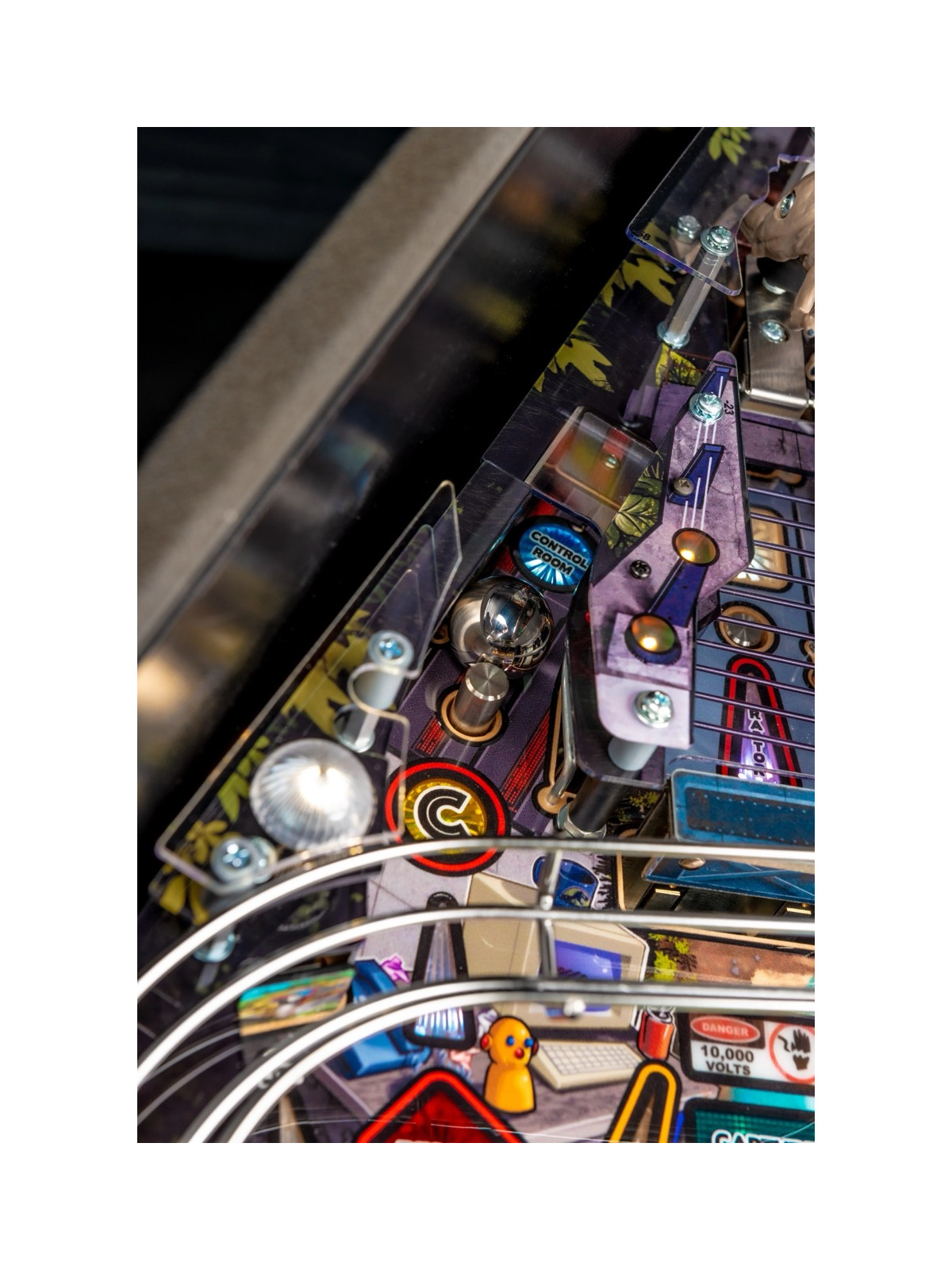 Le plateau se distingue par une architecture dynamique comprenant rampes rapides, cibles multiples, spinners, zones interactives et séquences scénarisées reprenant les moments clés de l’univers Jurassic Park. Les missions, modélisées autour de la capture des dinosaures, offrent une progression riche et une forte rejouabilité. Dans les versions Premium et Limited Edition, des éléments mécaniques additionnels, comme un T-Rex motorisé capable d’attraper la bille, renforcent encore l’immersion et l’impact visuel.