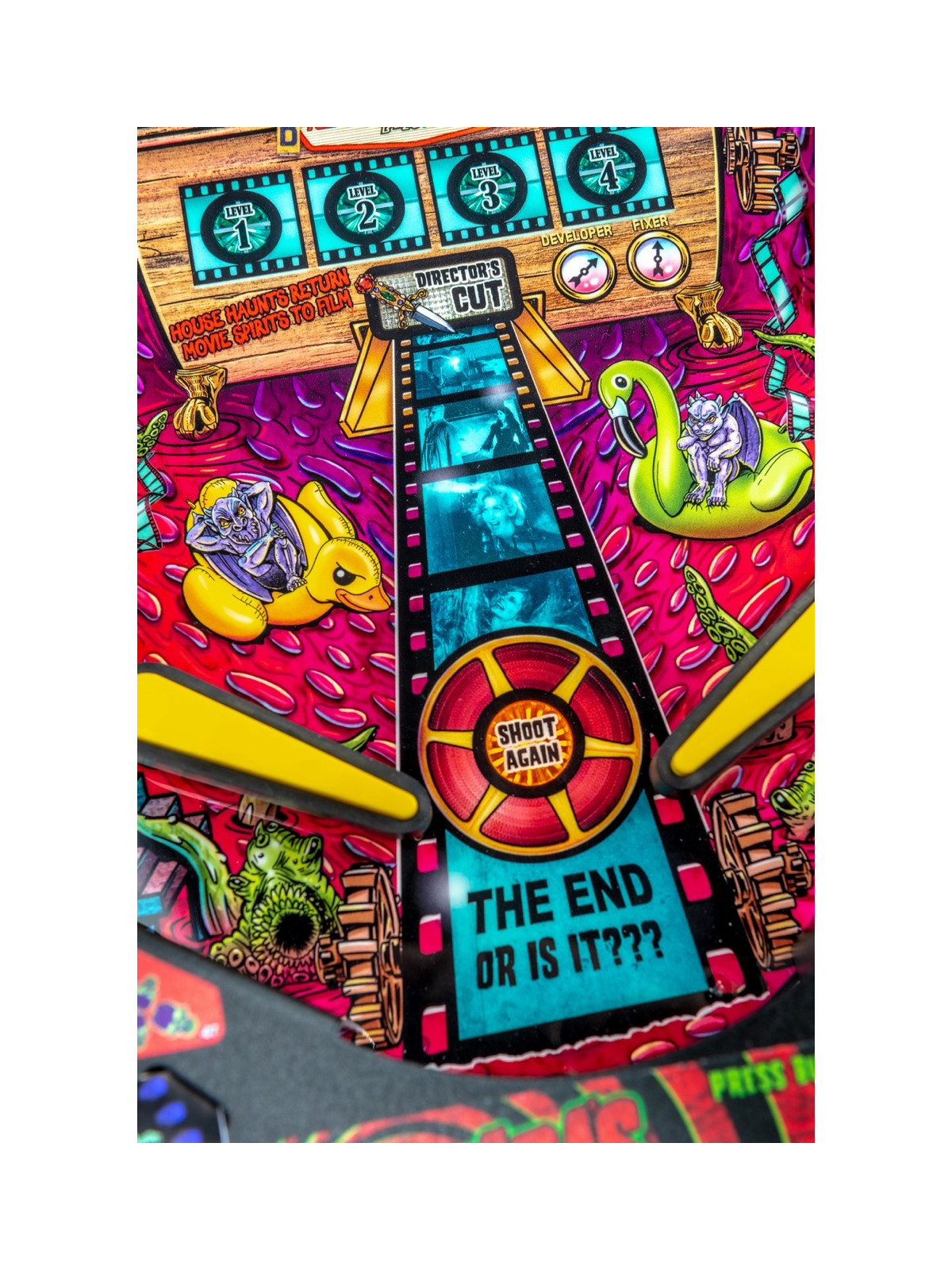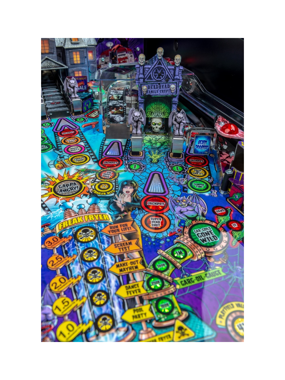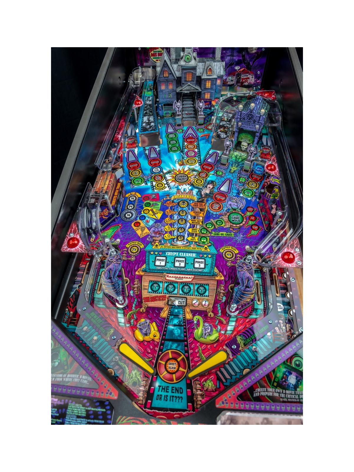 Le plateau de jeu présente une architecture riche intégrant rampes rapides, cibles multiples, spinners, lock mécaniques et zones dédiées aux différents « films » fictifs mettant en scène Elvira. Les versions Premium et Limited Edition incluent des fonctionnalités exclusives telles que la maison hantée animée, le gargouille kicker ou encore des décors plus détaillés, renforçant la dimension cinématographique et immersive du flipper. Les modes narratifs permettent de progresser à travers des séquences humoristiques, des scènes inspirées de films d’horreur classiques et des objectifs variés offrant une forte rejouabilité.