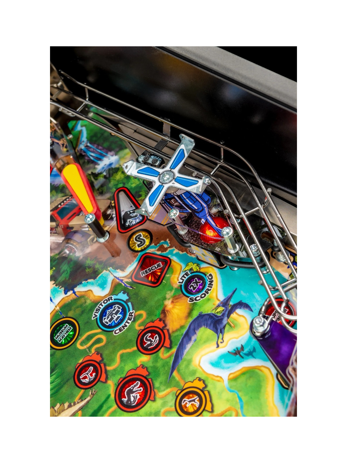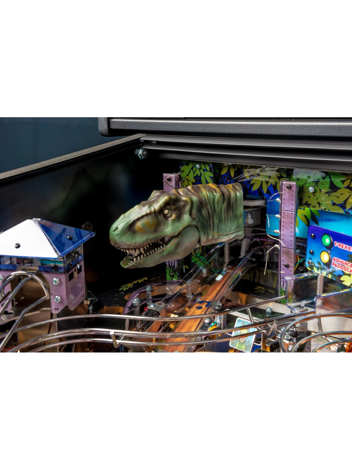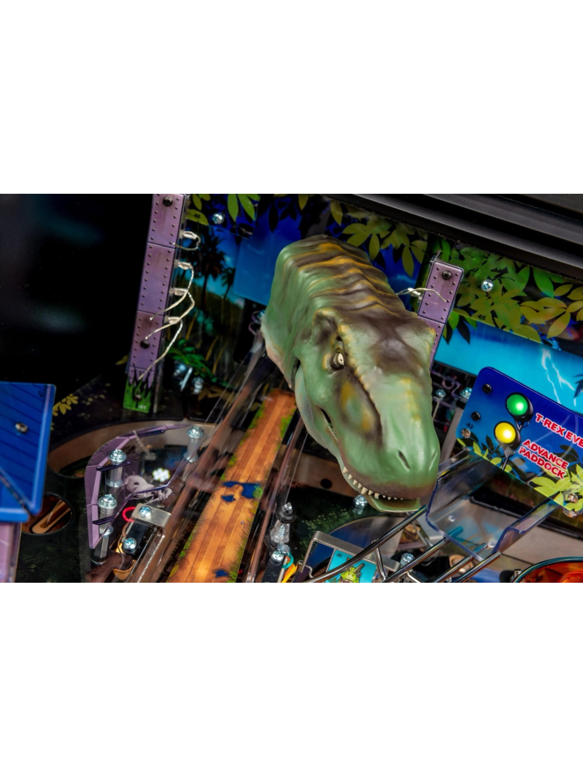Le plateau se distingue par une architecture dynamique comprenant rampes rapides, cibles multiples, spinners, zones interactives et séquences scénarisées reprenant les moments clés de l’univers Jurassic Park. Les missions, modélisées autour de la capture des dinosaures, offrent une progression riche et une forte rejouabilité. Dans les versions Premium et Limited Edition, des éléments mécaniques additionnels, comme un T-Rex motorisé capable d’attraper la bille, renforcent encore l’immersion et l’impact visuel.