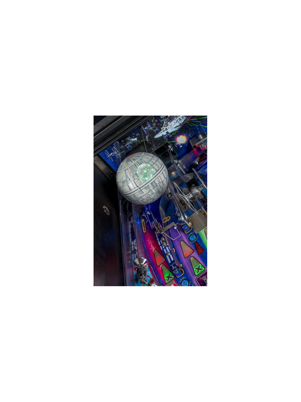 Le plateau présente une architecture dynamique composée de rampes rapides, cibles multiples, spinners, zones interactives et missions scénarisées centrées sur les batailles et personnages iconiques. Les joueurs peuvent choisir leur héros — Luke Skywalker, Leia Organa, Han Solo ou R2-D2 — influençant les modes de jeu et la progression des missions. Les versions Premium et Limited Edition ajoutent des mécanismes exclusifs, dont un mini-plateau Death Star motorisé, des éléments décoratifs renforcés et des effets lumineux avancés, renforçant la dimension spectaculaire de la machine.