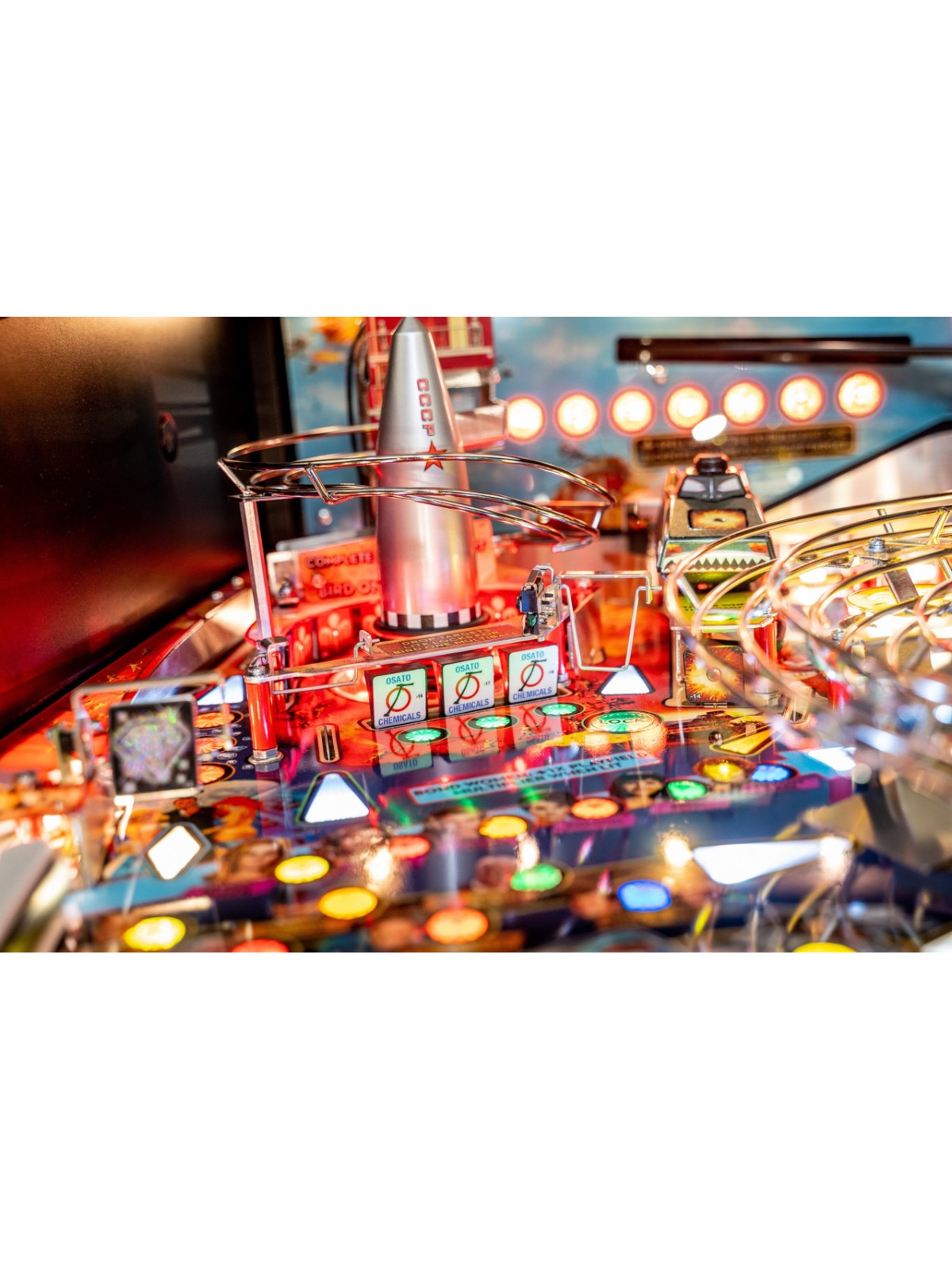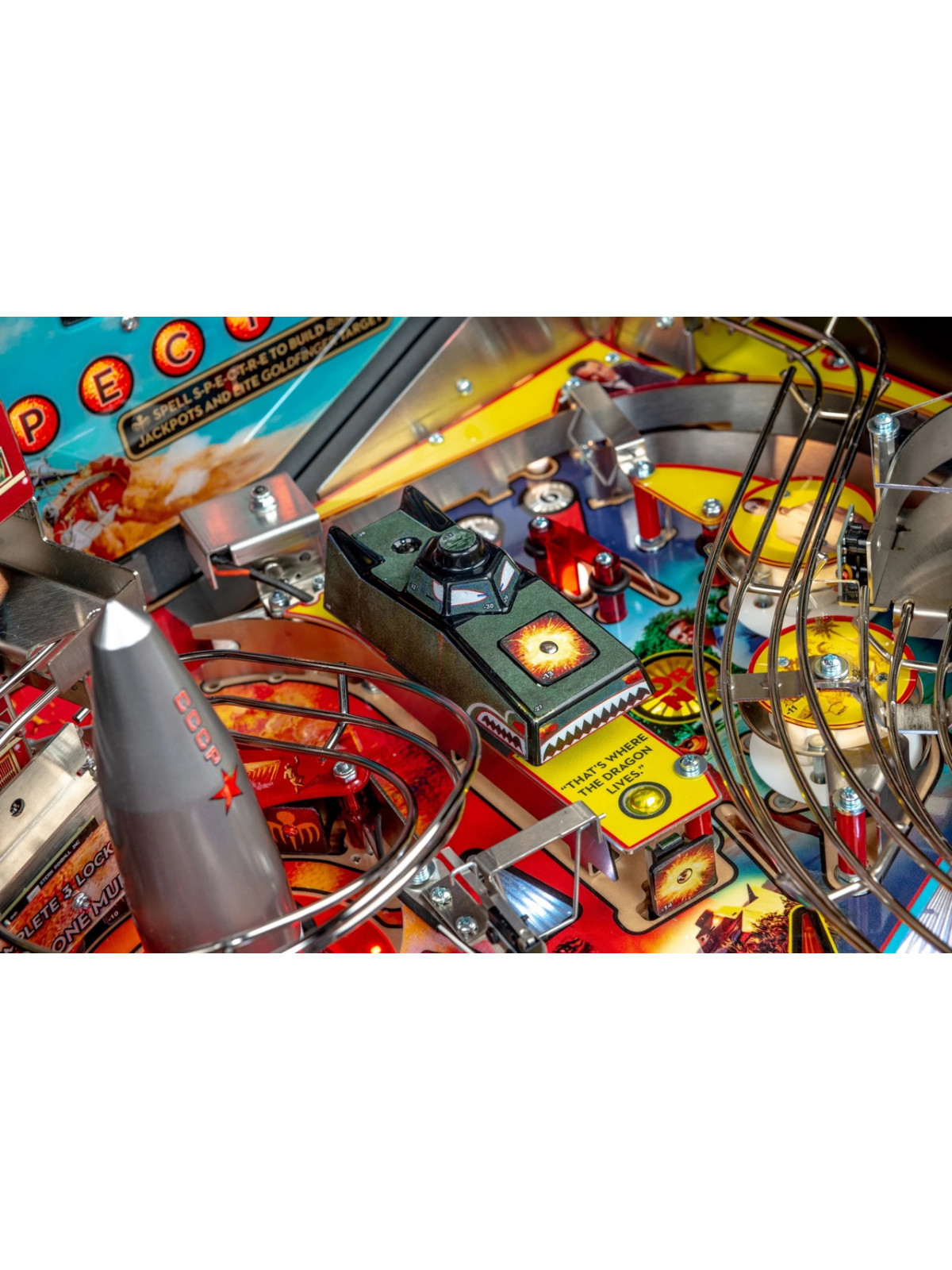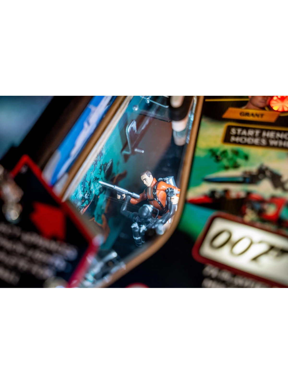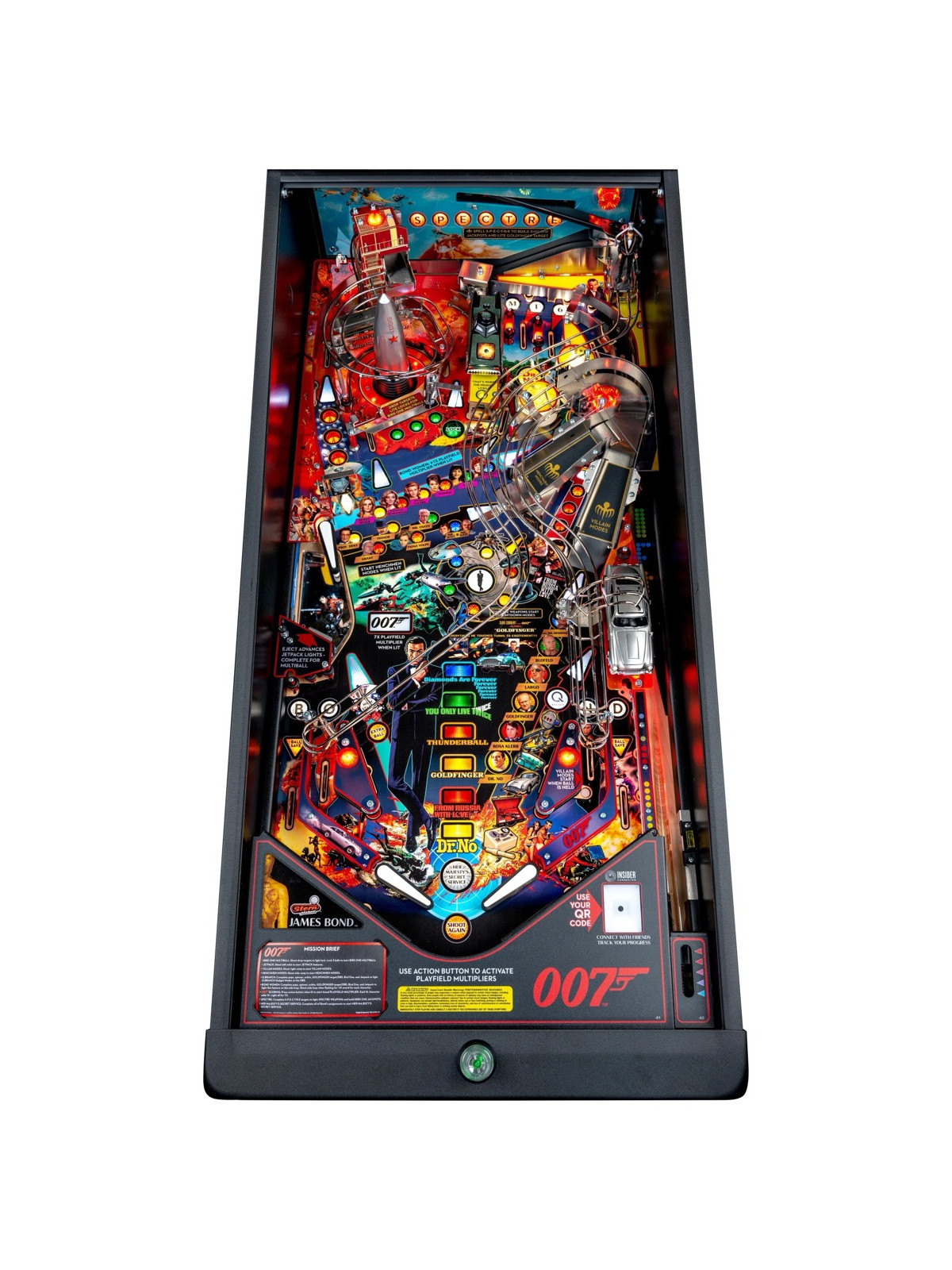 Le plateau de jeu intègre des rampes rapides, des mécanismes interactifs inspirés des gadgets emblématiques, des cibles multiples et des séquences scénarisées reprenant des scènes issues des films avec Sean Connery. Modes narratifs, multibilles thématiques et missions progressives assurent une rejouabilité élevée et une dynamique de jeu fluide. Les versions Premium et Limited Edition bénéficient de décors renforcés, d’animations supplémentaires et de mécaniques avancées, offrant une immersion encore plus poussée.