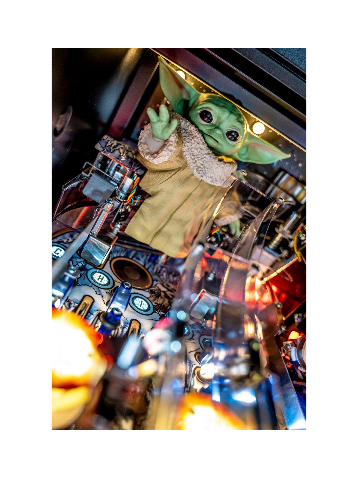 L’esthétique générale s’appuie sur des illustrations officielles de la série, appliquées au plateau, au translite et à la caisse. La bande sonore, comprenant musiques et effets directement inspirés de l’univers de The Mandalorian, contribue à une ambiance authentique et cinématographique. L’ensemble est propulsé par le système électronique SPIKE 2™ et la plateforme Insider Connected™, permettant un suivi des performances, des défis en ligne, des mises à jour logicielles et une gestion moderne de la machine.