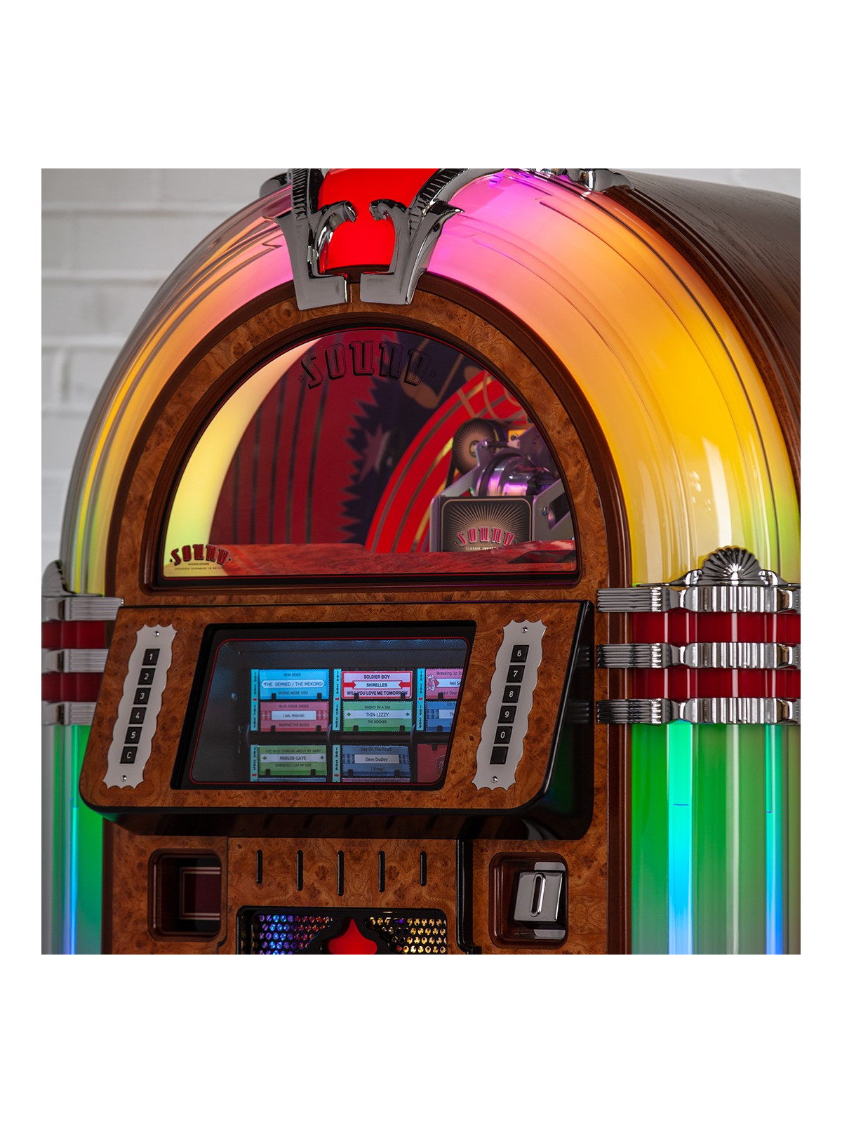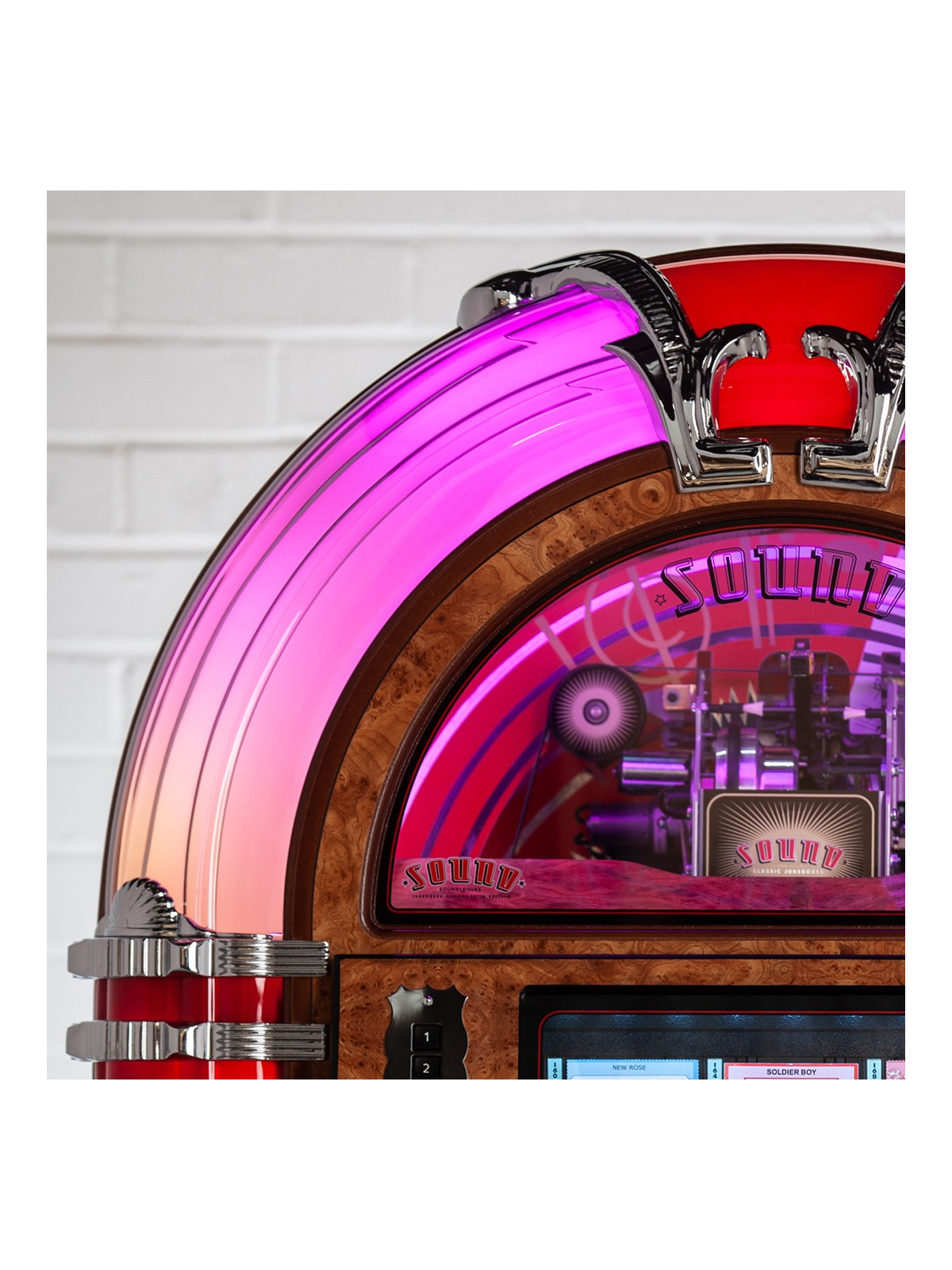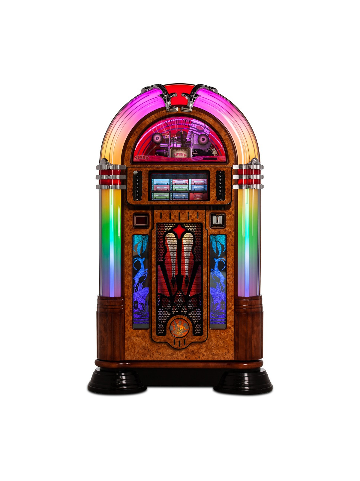 Son meuble en bois massif d’une seule pièce est orné d’éléments en aluminium/zinc chromés et de tubes à bulles protégés par des capots en polycarbonate, le même matériau que les boucliers anti-émeute, garantissant robustesse et longévité. Les finitions et placages sont personnalisables, permettant d’adapter le jukebox à tous les styles d’intérieurs : bar, hôtel, salon privé ou salle de jeux.