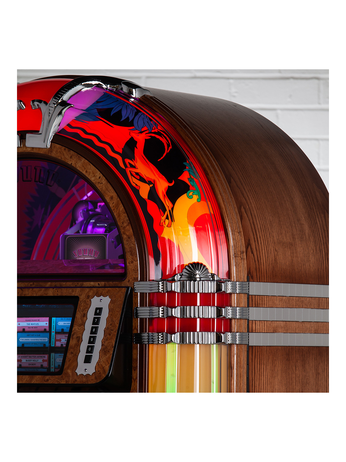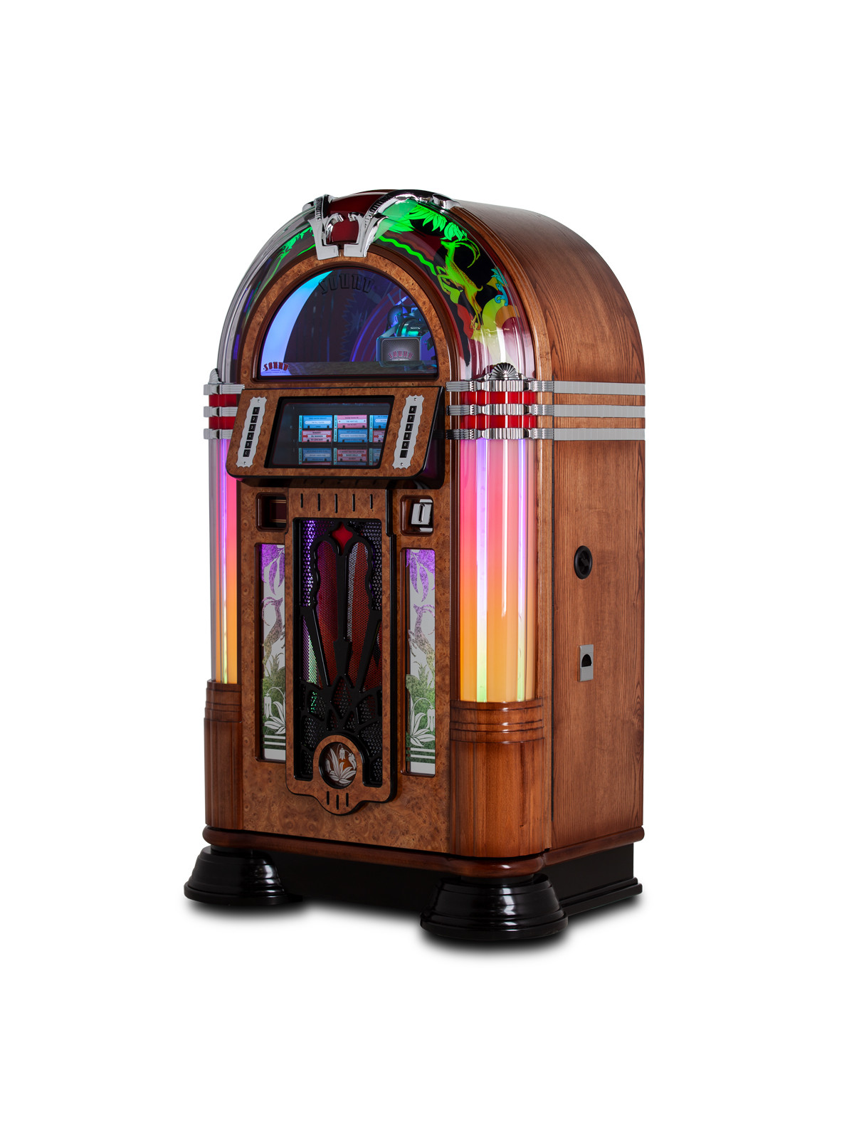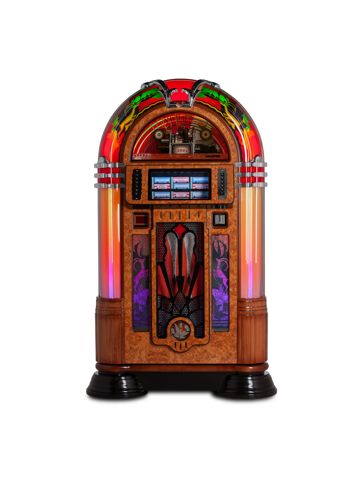 Côté son, le jukebox intègre un système audio puissant et parfaitement calibré, délivrant une restitution chaleureuse et immersive fidèle à l’esprit du vinyle. Sa connectivité moderne — dont le Bluetooth et l’entrée auxiliaire — permet également de diffuser de la musique depuis un smartphone ou un appareil compatible, offrant une flexibilité totale entre tradition et innovation.
