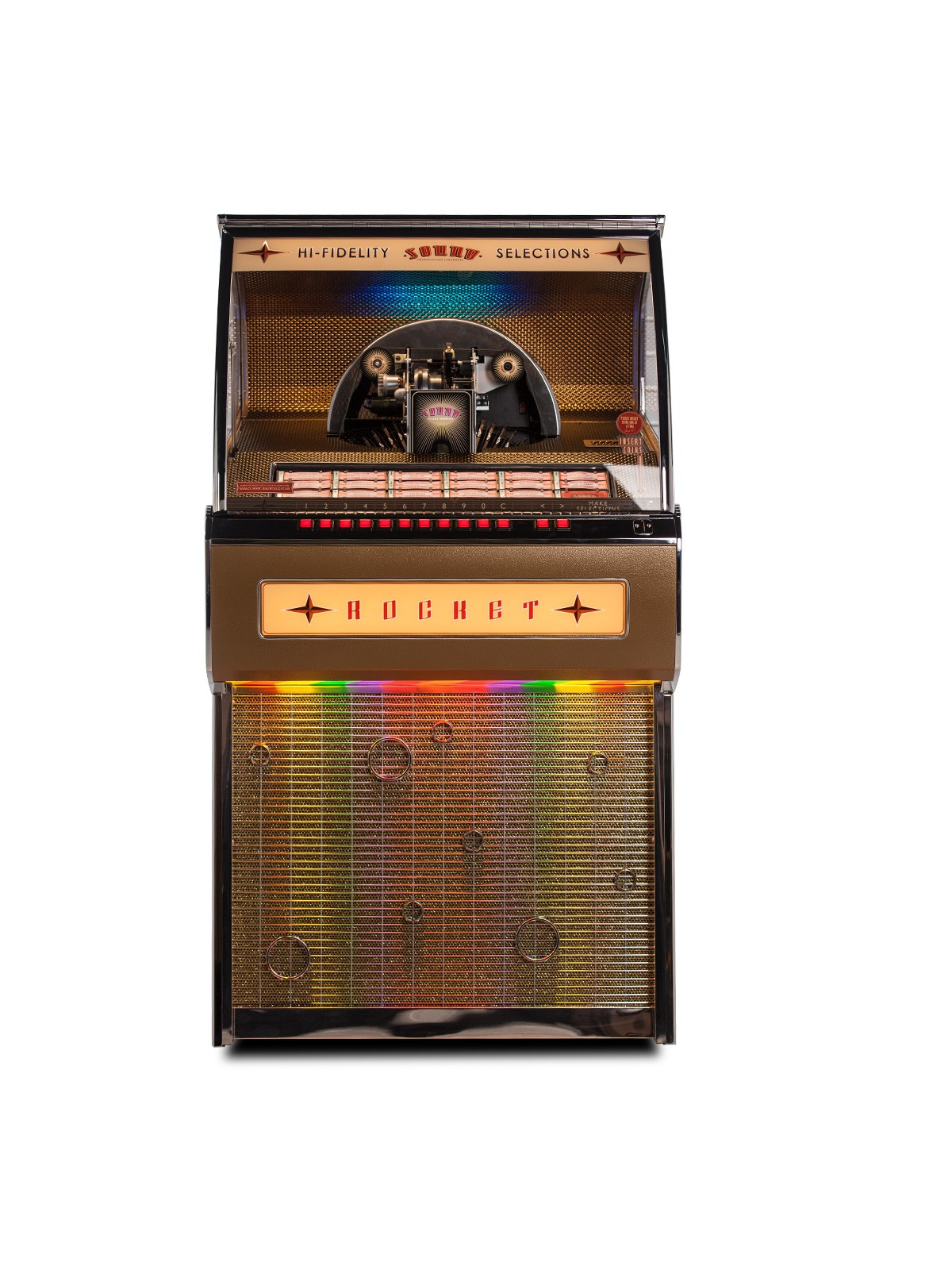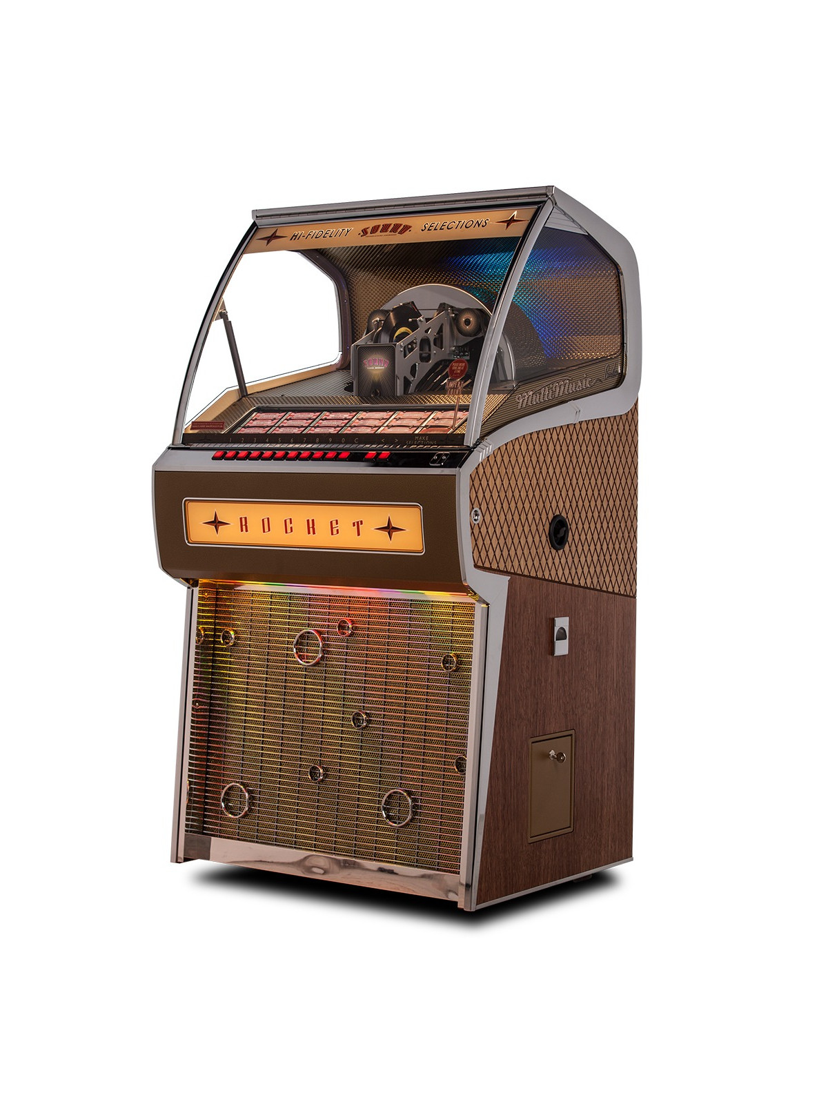 Fabriqué entièrement à la main au Royaume-Uni, le Rocket Vinyle bénéficie d’un meuble en bois massif, de finitions premium et d’éléments décoratifs soigneusement travaillés. Chaque détail reflète le savoir-faire historique de Sound Leisure, reconnu mondialement pour la qualité, la fiabilité et la longévité de ses jukebox.
