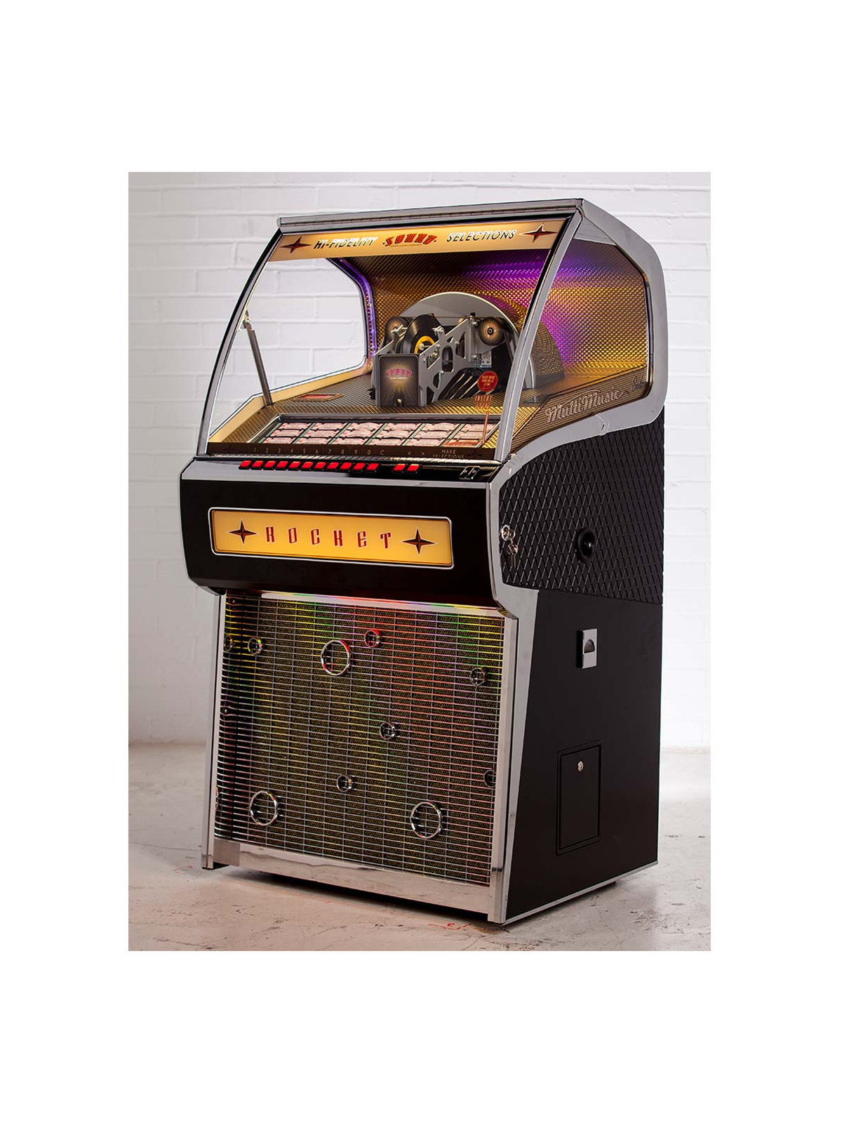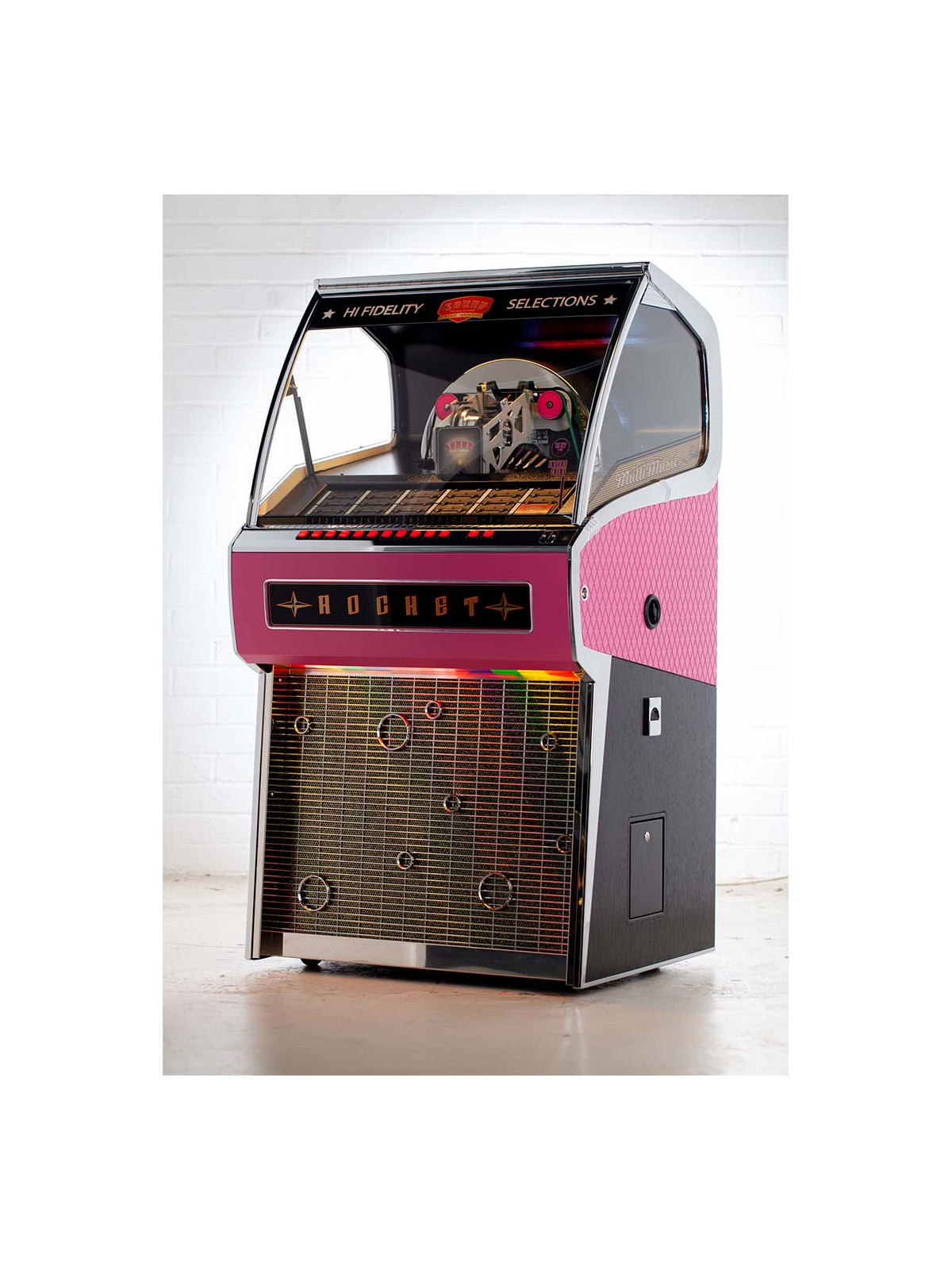 Le Jukebox Rocket 45 tours est l’un des modèles emblématiques de Sound Leisure, combinant un design rétro spectaculaire, une fabrication artisanale haut de gamme et le plaisir intemporel du vinyle. Avec ses lignes audacieuses inspirées des jukebox classiques et son esthétique affirmée, il s’impose comme une véritable pièce maîtresse décorative, aussi impressionnante visuellement que performante sur le plan musical.